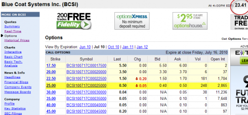 Notice how BCSI after the huge gap-down (red arrow) has been trading sideways between $22 and $23.50. Using technical nullification and feeling the prospects of a return to previous pricing will lead us to selling out-of-the-money calls, in this case the $25 strike. The option chain shows a return of near 2% for the next month out-of-the-money $25 call: