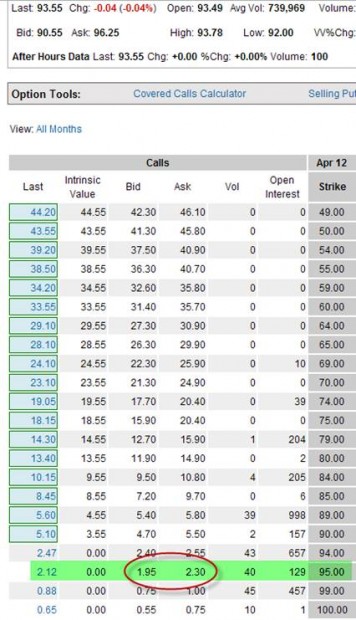 Covered Call Trade Orders: As discussed in previous articles, most writers of covered calls place their trades by legging in. This where a market or limit order is placed to purchase the equity and once executed, a second order (usually limit) is placed to sell the option. For maximum profits, these two legs should be executed simultaneously (Buy the stock and immediately sell the option. Do not buy the stock, go to the mall and then come back home to sell the option). Another methodology permitted by some online discount brokers (not USAA, the one I use) is to place a net debit order. This is where you buy the stock and sell the option at the exact same time, not for specific corresponding prices but for a limit net debit. For example, if a stock is selling for $20 and the A-T-M call is selling for $1.50, the net debit or amount we would owe is $18.50 ($20 minus $1.50). This way, even if the price of the stock and option change, the order can still be filled if it meets the requirements of our debit order. This would be particularly useful for investors who can’t be in front of their computers but want to execute a covered call trade. As stock investors and covered call writers it is critical to know and understand the different types of customer orders and the appropriate time to implement them.  Covered call limit order example: In the options chain below, ULTA is trading @ $93.55 and the bid-ask spread is $1.95 – $2.30. Placing a market order may generate $1.95 but placing a limit order slightly below the mid-point @ $2.10 has an excellent chance at being executed for an additional $15 per contract: