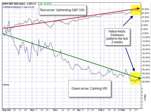 For the week, the S&P 500 fell by 0.5% for a year-to-date return of 11.6%. A 6-month comparison chart of the S&P 500 and the CBOE Volatility Index (VIX) shows bullish signals: