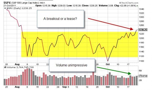 Today was a wonderful day but still only one day. We had a delicious combo plate of an encouraging European debt deal, more positive corporate earnings and positive economic news. Wonder what the “shorts” were up to. I will enjoy this day as I go to bed tonight looking for additional positive confirmation before I change my investment approach. Let me add, however, that the bullish bandwagon has been getting a bit crowded the past few days as many of the TV experts have been changing colors.