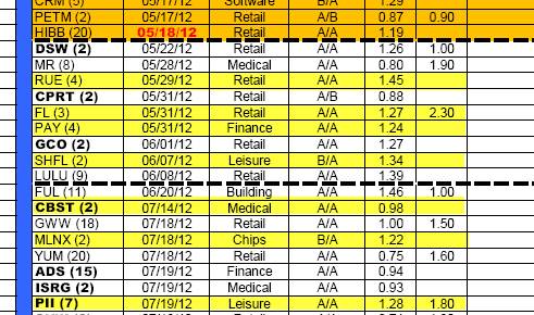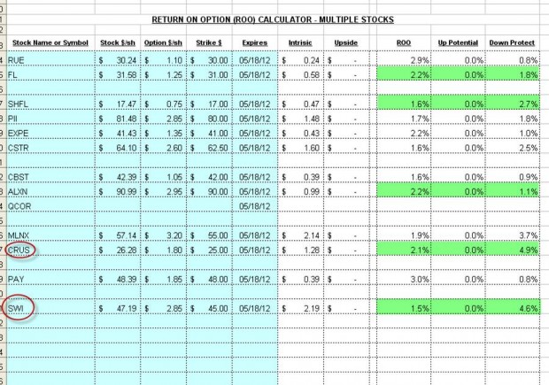 1- My goal changes from 2-4% to 1-2% for the remianing two weeks 2- I will favor in-the-money strikes in MOST market conditions because exit strategy execution becomes more challenging the closer we get to expiration Friday so I like the addition protection of ITM strikes. In strong bull markets I would have no issues going with the more aggressive OTM strikes. This past week I received a few inquiries about this topic so it led me to this week’s blog article. On Thursday evening, May 3rd I accessed our recent premium report and went straight to the “running list”. I then went to an options chain to see which candidates would meet the following goals: 1: 1-2%, 2-week return 2:  Decent downside protection of that profit Here is a partial view of that running list with a few stocks that I would consider: