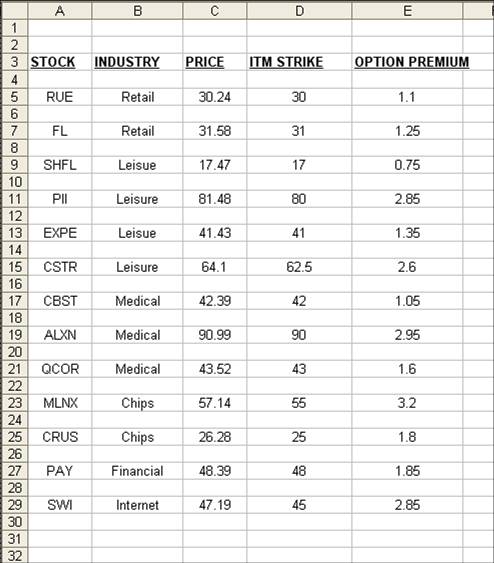 The yellow-highlighted cells are candidates worthy of entering into the Ellman Calculator based on option chain information. I then entered the potentially eligible stocks into a spreadsheet, including option chain information and industry information (remember that we must be properly diversified). Here’s what that looked like:
