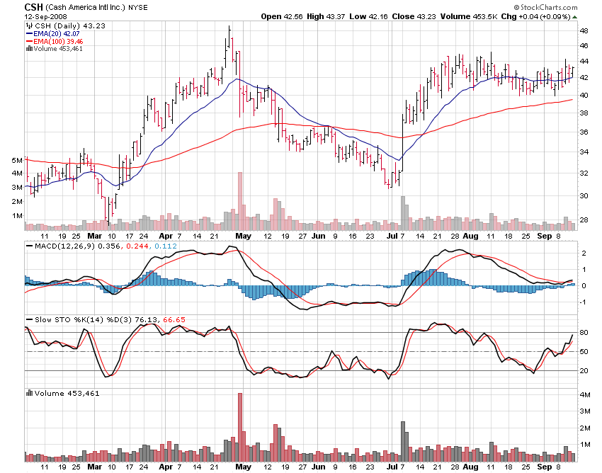 Jim Cramer  brought out a great point last week during his TV Program, Mad Money,  when he attributed much of the market volatility to “hedge funds gone wild”. He knows an awful lot about hedge funds since he managed one himself in the 1990s. For my readers unfamiliar with the term “hedge fund”, let me define:  A private, aggressively managed portfolio of investments, having a largely unregulated pool of capital, whose managers can buy and sell any assets, make speculative trades on rising as well as falling assets, and participate substantially in profits from money invested. It is open only to very wealthy, qualified investors. These investors are required to keep their (illiquid) money in the fund for at least one year. Since they are not open to the public, hedge funds do not have to make the same public disclosures as do mutual funds or brokerage firms. Historically, the term “hedging” implies reducing risk. This was done predominently via short-selling (the selling of a security that the seller does not own). Short sellers make money if the price of the stock goes down. More recently, hedge funds use dozens of different strategies, so it isn’t accurate to to say that hedge funds just “hedge risk”. In fact, because hedge fund managers make speculative investments, these funds can carry more risk than the overall market. In my book, DVDs, and CDs I often allude to the hedge funds as one of the “big boys”, a group that also includes banks, mutual funds,  and insurance companies. These groups collectively are responsible for more than 80% of the trading done in the market each day and therefore are the market movers. As Blue Collar Investors, it is our responsibilty to predict what these folks are up to and we do so via technical analysis and checking lists like “Stocks on the Move” on the IBD Homepage. Volume Surges or Spikes (see pages 78-79 in my book, Cashing in on Covered Calls) are the result of “big boy” activity. When hedge funds start short-selling, the glut of sales bring down share price. Label this simple supply and demand economics. This can now become contagious among other such funds and even average investors. Cramer’s point was related to the 370-point swing in the market on Thursday which he alluded to as “insanity”. This is a great word that can apply also  to the market in general lately which has been challenging at best. In his view, hedge funds were betting on a market collapse as worries about Lehman and Washington Mutual peaked. What do you do when you think the market will tank? You sell short and that’s what these “big boys” did. Later in the day, it became apparent that this theory was failing to materialize. Frantically, these funds started to cover (buy back shares before they went too high) and the market turned around dramatically. Cramer named 2 companies that “fought back” against these hedge funds. JOYG announced that it was buying back 2/5 of its capitalization (# shares x share price), or 2 billion dollars worth of stock between now and 2011. Cramer said the company had enough of the short selling and could almost take itself completely private if its stock keeps falling. The other equity he mentioned was our old friend CSX, whose embattled CEO Michael Ward won a proxy (vote of confidence by shareholders) battle with hedge funds to keep his job. That day, CSX reported a great earnings report and was up more than 10% in price. Cramer’s point regarding hedge funds accentuates our Blue Collar position that it is critical to do technical analysis as well as fundamental analysis in our investment decisions. We must anticipate the moves of these gazillionnaires. They have the ability to take down great companies and there is no one looking over their shoulders to warn us. How I found CSH: I took a look at The Stocks on the Move List on Friday’s IBD Homepage. I ran only those stocks that traded 50% above their normal daily trading volume (the “big boys” are taking positions). Suffice it to say that there weren’t many.The only one that made it through our system criteria was FISV. Next I scrolled down the Stock Check-up page to the list of the top-rated stocks in the same industry (Financial Services-Misc. Group): Top 5 Companies in the Financial Services-Misc Group Stocks Above $10 – Sorted By Best Overall Rating   Cash America Intl Inc  CSH    Ezcorp Inc Cl A  EZPW    M & F Worldwide Corp  MFW     Lender Processing Svcs   LPS    Fiserv Inc  FISV Then I evaluated the 4 equities ranked ahead of FISV. MFW was eliminated because it was not optionable and had low volume. LPS was removed from consideration because it became public in July and thus has a limited history. Finally, I checked the calculations and liked CSH the best of the 2 remaining stocks (CSH and EZPW). Let’s look at the chart and sell the option: