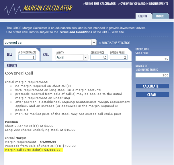 As you can see, the amount of cash required to invest is reduced from $8000 to $3600 by taking 50% of the $8000 and then subtracting the $400 generated from the sale of the short call. Let’s assume our shares are assigned and calculate our returns with and without margin: