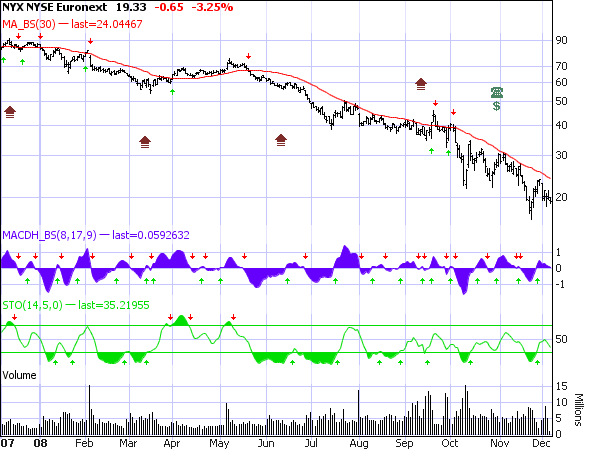 If we were to ask the average investor this question: What does the ticker NYX stand for? The most likely answer would be: The New York Stock Exchange. We would respond: Good answer, but you only get partial credit! The reason for this is that in this global economy businesses must offer multiple product and service lines. In order to flourish, the New York Stock Exchange can no longer stand alone. Let me give you an analogy. When I purchased my first home and I needed a new faucet for my sink, I would drive a few miles north to the local plumbing supply store. When I needed a new ceiling fixture for my bedroom, I would travel a few miles south to the local lighting supply shop. Winter is upon us and I needed a snowblower, so I commuted a few miles west to the garden supply store. When I got ambitious and decided to build a shed in my backyard, I drove a few miles east to the lumber yard. Today when I need a faucet, lighting fixture, snowblower, and lumber I go to Home Depot around the corner. Mom and Pop businesses are a thing of the past and one stop shopping is the name of the game. So what is the correct answer to the question? What does NYX stand for? The answer is: NYSE Euronext, Inc. This entity brings together major marketplaces across Europe and the United States whose histories stretch back more than four centuries. It is by far the largest combination of its kind and the first to create a truly global marketplace group. NYSE Euronext is headquartered in New York City with European operations run out of Paris. Let’s break down the components of NYX: 1- The New York Stock Exchange (NYSE)- the premier lisiting venue for the world’s leading large- and medium- sized companies. They meet and adhere to the overall highest listing standards. It is the largest and most liquid equities exchange in the world. 2- NYSE Arca– a fully electronic exchange for growth-oriented enterprises. Listed companies can grow on NYSE Arca and transfer easily to the NYSE once they meet the rigid requirements. This all-electronic entity is also a leading listing and trading platform for exchange-traded funds (ETFs like the Qs), offering the largest public ETF liquidity pool in the U.S. 3– NYSE Euronext– the primary market in the Eurozone for large- and medium-sized companies. It is the first integrated cross-border exchange, combining in a single market the stock exchanges of Portugal, the Netherlands, France, and Belgium. 4- NYSE Alternext- is a pan-European market designed specifically for emerging companies. Listed companies benefit from more flexible access requirements and innovative operating rules while insuring market transparency. On October 1, 2008, NYSE Euronext completed acquisition of the American Stock Exchange. It was integrated with Alternext European small cap exchange and renamed NYSE Alternext U.S. This allowed NYSE Euronext to become the third -largest U.S. equity options marketplace. It also advanced their leadership in ETFs, cash equities, closed-end funds and structured products. In this new frontier wherein the global components are playing larger and larger roles, entities such as the New York Stock Exchange are looking towards mergers and acquisitions to keep pace. Those that don’t will end up like the mom and pop businesses of yesteryear. Despite these apparently wise business maneuvers, NYX has not been treated well by the investment community. Now it’s true that all financial related equities have been hammered but it seems to me that this equity has been hit harder than average. If you view the charts below, you will see a steeper and higher percentage decline in the share price of NYX than the investment/broker industry in general: