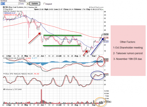 Covered Call Trade Orders: Most writers of covered calls place their trades by legging in. This where a market or limit order is placed to purchase the equity and once executed, a second order (limit) is placed to sell the option. For maximum profits, these two legs should be executed simultaneously (Buy the stock and immediately sell the option. Do not buy the stock, go to the mall and then come back home to sell the option). Another methodology permitted by some online discount brokers (not USAA, the one I use) is to place a net debit order. This is where you buy the stock and sell the option at the exact same time, not for specific corresponding prices but for a limit net debit. For example, if a stock is selling for $20 and the A-T-M call is selling for $1.50, the net debit or amount we would owe is $18.50 ($20 minus $1.50). This way, even if the price of the stock and option change, the order can still be filled if it meets the requirements of our debit order. These orders are executed via buy-write combination forms. This would be particularly useful for investors who can’t be in front of their computers but want to execute a covered call trade. As stock investors and covered call writers it is critical to know and understand the different types of customer orders and the appropriate time to implement them. BCSI Update: Some of our members held this stock through the May 27th and August 19th earnings reports. Unfortunately, neither report satisfied the institutional investors and the price dropped from $35 to $17…ouch. As a result, many requested that I write an article on the topic of managing stocks that have gapped down. I did so on June 19th and noted that at the time BCSI was in a trading range and seemingly outperforming the market in general. The stock fell further after the August report. Since that time, BCSI has been the subject of takeover rumors and still remains a strong company as the institutional investors are moving back into this equity. There will be a shareholder meeting next month and another ER due out on November 19th that could affect the price in either direction. Here is an updated chart for this stock:
